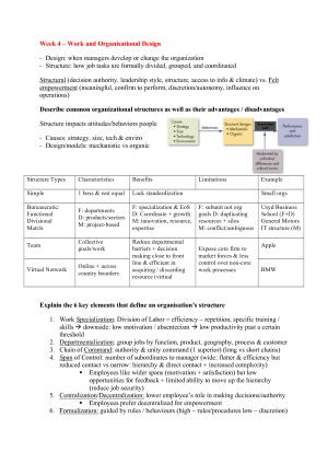Notes cover the entire subject; lectures, tutorials & readings. Set out under weekly learning outcome questions providing a succinct outline of key points. Logically set out with use of diagrams making it convenient to zero in on specifics or scan through the pages for an overall impression of the course. The layout is especially useful in the open book exam because you can quickly find specific topics and use the example pages for evidence. Week 2 – Individual Attributes, Personality & Values Week 3 – Group and Team Dynamics Week 4 – Work and Organisational Design Week 5 – Needs & Motivation Week 6 – Emotions and Emotional Intelligence Week 8 – Organisational Change Week 9 – Organisational Culture Week 10 – Perception & Decision Making Week 11 – Stress and Conflict Week 12 – Managing Diversity
