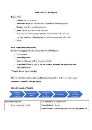 Full, comprehensive notes for Marketing Theory and Practice. Useful for assignments, weekly quizzes and the final exam. Diagrams and explanations of content included. These notes helped me obtain a 90 (HD) for the unit. Notes are organised by weekly topics: WEEK 1 – WHAT IS MARKETING? WEEK 2 – KEY MARKETING TERMS WEEK 3 – MARKETING ENVIRONMENT WEEK 4 – BUYER BEHAVIOUR WEEK 5 – MARKETING INFORMATION WEEK 6 – SEGMENTATION, TARGETING AND POSITIONING WEEK 7 – PRODUCT WEEK 8 – PRICING WEEK 9 – DISTRIBUTION/PLACE WEEK 10 – PROMOTION (COMMUNICATION) (IMC) WEEK 11 – CURRENT ISSUES IN MARKETING PRACTICE WEEK 12 – STRATEGY AND PLANNING