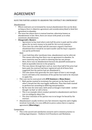 Notes contain detail on agreement, performance, breach, common law damages, equitable damages, vitiating factors etc. The detail is suited to that required for a closed book exam.