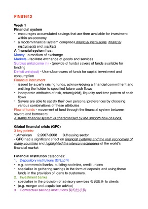 This note concludes full details for the whole semester of FINS1612 with chart explanation. It includes the content of the lecture notes, the tutorial notes, and the extra information from google. It's better for Chinese because there are some Chinese translations. Just download it and you can use this one through the whole semester and especially for the mid-term and final exam