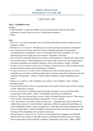 Highly condensed, easy to follow summary of negligence. A step-by-step guide for use in the final exam. Includes case and statute (CLA NSW) references.