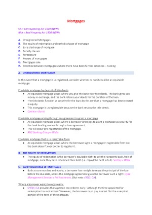 - A concise set of final exam notes. - Clear guide to answering problem questions. - Includes relevant and concise case summaries. - 33 pages of full colour - Topics include: Mortgages Co-ownership Leases Covenants Easements Note: the sample shows the first few pages of each topic included.