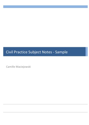 Thorough 104 pages notes for the subject Civil Practice at UTS. These notes took me a very long time to make but were very worth it in the end. I used them in my final exam and did very well (obtained a distinction). The notes contain all the content required to answer the final paper and they are well set out so that you know exactly were to look during your exam. The subject is very interesting but the lecture powerpoints are too concise and the textbook too long so a good set of notes is very important if you want to get a good grade in this subject! These notes contain a very detailed contents page which is very handy for the final exam. You need detailed notes for the exam! Good luck :)