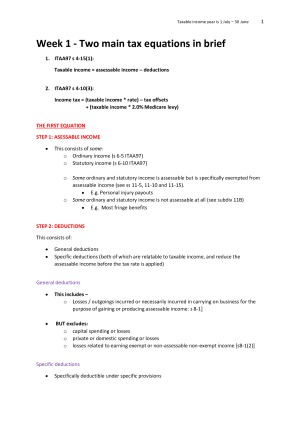 Week 1: Introduction, Residence, and Source Week 2: Ordinary income and personal service income Week 4: Business Income and hobbies Week 4: Isolated transactions Week 5: Statutory income Capital Gains Tax Topic 6/7: General Deductions Topic 8/9: Specific Deductions Topic 10: Taxation of Entities Topic 11: Tax Avoidance Topic 11: Tax Administration