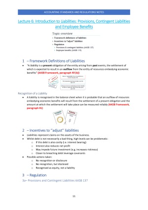Extensive summary on Accounting Standards and Regulations notes structured to cover all the points listed in each lecture outline. Includes tutorial worked examples that really help for the final exam. Contains: Lecture 2: Revenue Lecture 6: Introduction to Liabilities: Provisions, Contingent Liabilities and Employee Benefits Lecture 7: Leases Lecture 8: Foreign Currency Lecture 9: Financial Instruments 1 Lecture 10: Financial Instruments 2 Lecture 11: Accounting for Income Taxes