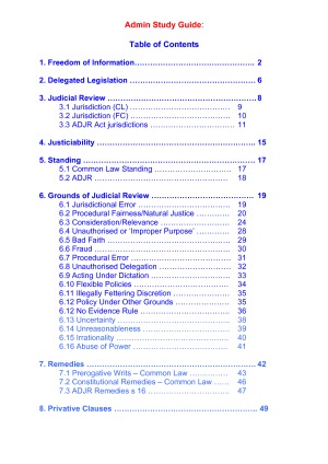 A perfect, concise summary of every aspect of Admin Law broken down into the key elements. Perfect as a guide for the exam. Got a HD in the exam to pull overall mark up to a D.