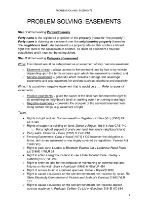 Despite not receiving an A for the take home exam I did very well in the exam and managed to get an A in the subject overall. The templates I have created will be extremely beneficial to anyone, despite whether you have done extensive study for this subject. There are answer templates for each topic. Topics: Problem Solving & Answer Templates Caveats Co Ownership: Joint Proprietors & Tenants in common Constructive Trusts (Common intention, Joint Endeavour & estoppel) Easements Equitable Mortgages Incomplete Gifts Indefeasibility Leases Legal Mortgages Part Performance Resulting Trusts Specifically Enforceable (contract, lease, mortgage)