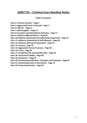 These are the notes I have compiled from the class reading list as required for the final exam. It includes the relevant cases and legislation from each of these readings. Please note that the final exam did not include Sexual Assault, so the readings for the two classes on this topic were not included