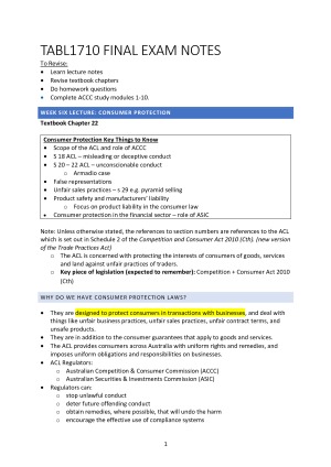 Here is a set of comprehensive notes for Business and the Law (TABL1710) including: - Textbook notes - Lecture notes - Tutorial notes - Collated information from relevant legislation - Detailed information from the ACCC modules recommended by course convenors. Contains lectures 6 onwards.