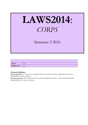 These notes for Corporations Law were made using previous students notes, textbook readings, online summaries and lecture notes from 2 different streams. It clearly sets out the notes under topic headings and highlights the main points to know. Comprehensive case analysis is provided as well as relevant statutory provisions. My notes are extremely long and comprehensive but are highlighted to bring to your attention important details. The point is that everything is covered so you can be sure that no detail is spared.