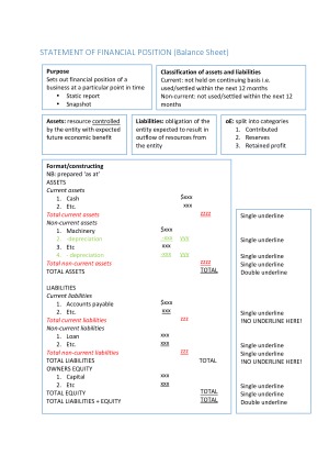 Very condensed notes (cheat sheets) covering the following topics: budgeting, costing, CVP analysis, ratios, Statement of Financial Performance, Statement of Financial Position, Statement of Cash Flows. Good for looking over before heading into the exam to get an overview and also for learning the structure of the statements.