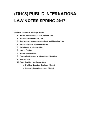 2017 Spring Public International Law Notes. It covers: - All topics - concise notes based on the readings - FULL case summaries and relevant treaties/convention sections - Problem Question Scaffolds and Essay preparation These notes are useful for: - the Moot Assessment - Good for picking up easy CP marks with full cases - Covers everything for the exam including tips for the Problem Question and Essay components These notes have everything you need for Public International Law. I got a distinction 80