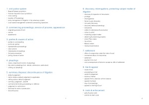 1. civil justice system 2. commencing proceedings, service of process, appearance 3. parties & causes of action 4. pleadings 5. summary disposal, discontinuance of litigation 6. discovery, interrogations, protecting the subject matter of litigation 7. settlement 8. trial & appeal 9. costs & enforcement