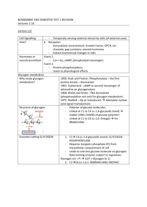 BCMB30004: Cell Signalling and Neurochemistry exam and MST review notes. These notes are mostly in tabulated form which helped me to contrast different proteins/signalling events/complexes (e.g. modulation of glycogen phosphorylase through covalent vs allosteric regulation as seen in the sample). These notes are perfect for both studying new content for the first time and also revising for the MST/exams as a checklist. I've also included some study tips, tricks and what to focus on for the exam/MSTs/assignment which helped me to achieve 95% for this subject. Good luck!