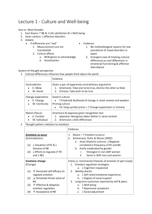 This is the concise revision notes for PSYC30022 Trends in Personality and Social Psychology. These notes preserve all of the content from these 2-hour lectures into as little pages as possible (~4 pages). This is done by utilising symbols, diagrams, graphs and tables instead of walls of texts. This would save you time during revision and make the content more understandable through visualization. It is perfect for previewing a lecture, assignments, revision and last-minute cramming. Contains: Lecture 1 - Culture and Well-being Lecture 2 - Pain Lecture 3 - Romantic Attraction Lecture 4 - Group formation and Commitment Lecture 5 - Moral Frontiers Lecture 6 - Body Image and Eating Disorders Lecture 7 - Emotions Lecture 8 - Emotion Dynamics Lecture 9 - Personality processes Lecture 10 - Stability and change Lecture 11 - Personality neuroscience Lecture 12 - Personality, cognition, and creativity