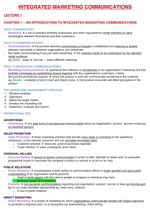 - 52 pages of in-depth notes taken in both lectures and tutorials throughout the course - Includes lecture content, case studies, examples, diagrams from slides and information given about the assessments / final exam - Colour-coded with definitions, case studies, references and exam requirements - Easy to read, nicely formatted notes that helped me achieve a distinction in this subject