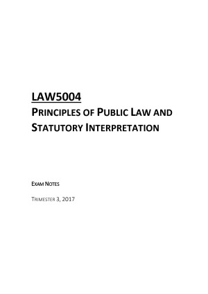 Exam notes created in Trimester 3 2017 for LAW5004 Public Law and Statutory Interpretation (Monash JD). These notes are designed to act as a clear and concise checklist. They clearly go through through each step that must be considered in an exam, and are filled with clear authorities. They also discuss key public law principles and how to apply them. These notes have been colour coded for ease of use. These Notes Include: -Foundational Concepts, Relationships and Structures -The Parliament -The Executive -The Judiciary -Public Law in Practice: Human Rights -Statutory Interpretation -Case Studies and Relevant Legislation Note: For the best preview of the notes, view the 'preview' on a non-mobile device. Disclaimer: The accuracy of these notes is not guaranteed