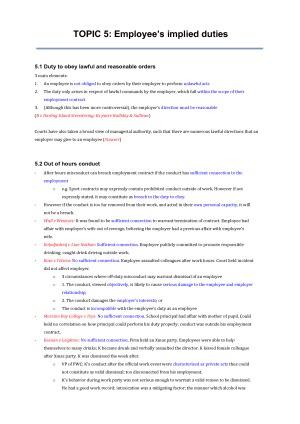 Extensive employment law notes, includes case summaries, relevant sections of the Fair Work Act and a clear topic structure for the exam. Received an overall D in the unit [HD in exam worth 60%] (Sem 2, 2017). Hope these notes help :)