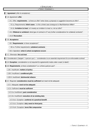 Unlike the latter part of the course, my notes are structured (as can be seen in the first 5 pages of the sample). These notes outline the facts of each case in the footnotes so that 'background' knowledge doesn't clog up the main body of the doc. I went very well in this subject, but that is probably also due to the fact that I was one of the only students who had studied 3 semesters of law before completing it. The four topics were: contract, property, estoppel, & agency. Good luck in the exam!