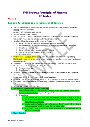 This is a very comprehensive set of notes covering the overall Principles of Finance course from lectures which I made throughout semester 2 2017 and received a grade of First Class Honours (H1) for the subject. After adding to the notes each week, and after completing assignments and the mid semester test, I also reviewed them at the end of the course to ensure that the most important parts were included. The notes are UP TO DATE to the current curriculum and includes all topics for the course. Everything is explained very clearly and can be easily understood. It is very neatly formatted with colours, highlighted, underlined and bold text, as well as many pictures. While these notes are very comprehensive, if you would prefer a SUMMARY as a meaningful final revision before your exam, I would recommend you reading only the bolded and highlighted text which should emphasize the main points and refresh your memory on some things which I believe would be very useful to know for the exam. (Tip: Use Ctrl-F and type a word to quickly search what you are looking for) The SAMPLE of my notes contains 10 pages. The actual full notes contains 65 pages. All the best with Finance!