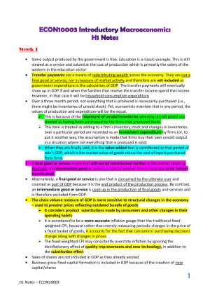 This is a very comprehensive set of notes of the overall Introductory Macroeconomics course which I made throughout semester 2, 2017 and received a grade of First Class Honours (H1) for the subject. The notes are UP TO DATE to the current curriculum and includes all topics for the course. After having done my exam, I have reviewed my notes, added some things, and emphasised the bits which I believe are a must-know for the final exam. Everything is explained very clearly and can be easily understood. It is very neatly formatted with colours, highlighted, underlined and bold text, as well as many pictures. While these notes are very comprehensive, if you would prefer a SUMMARY as a meaningful final revision before your exam, I would recommend you reading only the bolded and highlighted text which should emphasize the main points and refresh your memory on some things which I believe would be very useful to know for the exam. My notes contain a mixture of what is covered in LECTURES, TUTORIALS and PRESCRIBED READINGS, as well as from ASSIGNMENTS after I have reviewed the solutions. They have been separated into the contents from weeks 1 to 12. I recommend reading them each week to help your understanding of the course. (Tip: Use Ctrl-F and type a word to quickly search what you are looking for) As they contain notes from the prescribed readings, you may not need the textbook. The SAMPLE of my notes contains 10 pages. The actual full notes contains 79 pages. All the best with Macro!