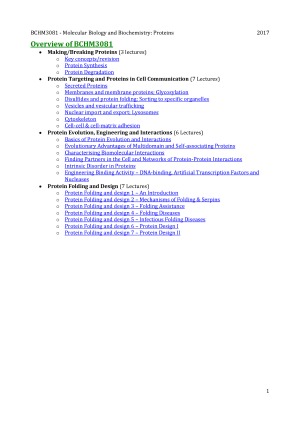 This is my lecture summary notes for BCHM3081: ☞ Cover all lectures spanned across all 4 blocks ☞ Concise summary of lecture material arranged under uniquely colour-coded learning objectives ☞ PDF document with hyperlinked menu for easy access to lectures ☞ Colour coded diagrams and flowcharts ☞ Integration of extracurricular material to better understand lecture contents ☞ Essential knowledge only, no extra BS Sample is of lecture 1 and 2 ☞ Hyperlink removed in the sample, rest assured that in the full version it will be working