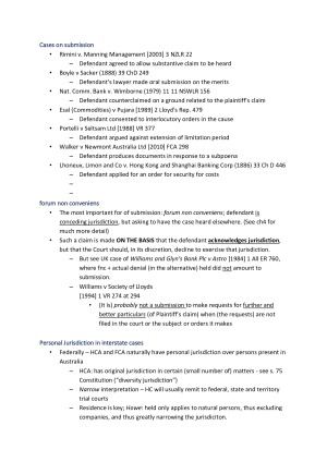 **These notes are for LAWAS404: Public Private International Law** These notes feature a comprehensive nine and a half (9.5) pages of contents at the beginning of the notes to easily and quickly find what you are looking for in an exam. Topics range from personal jurisdiction, grounds of jurisdiction, exceptions and immunities, restraints on proceedings, proof of foreign law, exclusion of foreign law, international arbitration, choice of law in contract and in tort and key cases such as Pfeiffer, Zhang and Gutnick. These notes also cover Renvoi, classifications of property, and public international law. Included also are definitions of common latin translations e.g. forum non conveniens and Lis alibi pendens.
