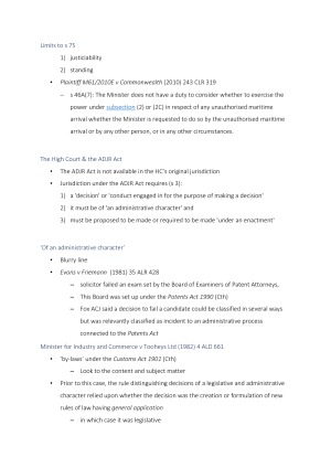 These notes feature eleven (11) pages of numbered contents to find easily and quickly what you are looking for in an exam. Topics covered in notes include: Merits review, AAT tribunal, Ombudsman and investigatory bodies, Government Accountability, Access to Government Information, Delegated Legislation, Judicial Review and Standing, Ground for Review, Unauthorised Decision-Making, Consideration and Purpose, Unreasonableness, Reasons for Decisions and Remedies. All topics include relevant cases.