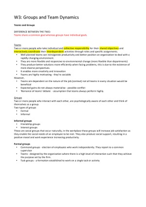 Completed set of course notes complied from lecture slides, readings and the textbook. Contains detailed examples of key concepts, list of weekly tutorial activities and a HD example of a weekly journal entry. Contains: W1: Introduction to Organisational Behaviour W2: Individual Attributes, Personality & Values W3: Groups and Team Dynamics W4: Work & Organisational Design W5: Emotions & Emotional Intelligence W6: Needs & Motivation W6: Perception & Decision Making W7: Communication W8: Mindfulness at Work W9: Managing Diversity W10: Organisational Culture