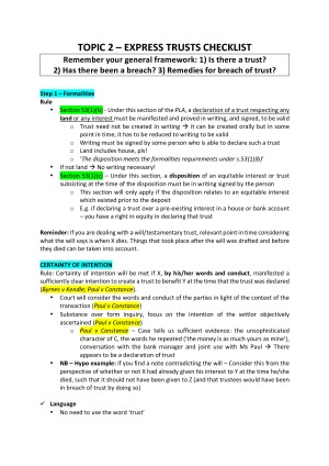 These extended notes for Trusts contain relevant cases, legal principles and statutory provisions required for the final examination. They help you organise and structure your answer to a hypothetical question.
