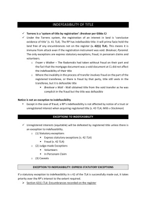 These extended notes for Property Law contain relevant cases, legal principles and statutory provisions required for the final examination. They help you organise and structure your answer to a hypothetical question.