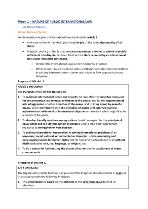2017/18 Complete Public International Notes Includes: * Complete Notes * Lecture Notes & Reading Materials * Case Law summaries and Legislation Includes topics: * The sources of international law * Relationship between international law and municipal law * Personality and recognition * Jurisdiction and immunities * The law of treaties * State responsibility * The peaceful settlement of international disputes * The use of force Useful for: * Tutorials * Moot assignment * Final exam