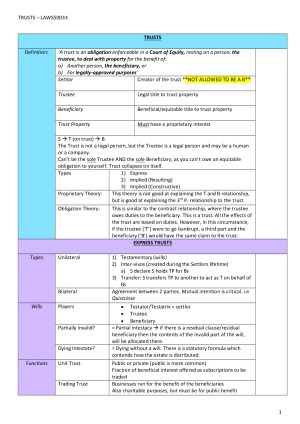 Exam & Hypothetical Notes for Trusts. Outlines: - Relevant case citations & "rules" - Colour coordinated - Hypo structure for answering an exam question - Easy to use in exam