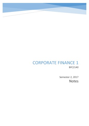 These notes are a comprehensive reference for Corporate Finance 1, with explanations, formulas and diagrams compiled into a well-presented document. They can be used as a reference alongside your own personal notes and/or a last-minute reference to print out for your mid-semester test or exam. The entire BFC2140 course is covered in these notes in a clear and concise manner. Ultimately, they helped me achieve a grade of HD for the unit. The combination of presentation, clarity and detail in these notes makes them a worthy investment for success in this unit.