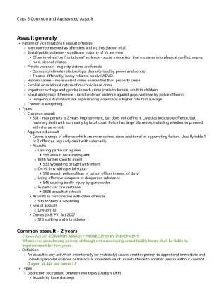 These Criminal Law notes combines material from lectures and readings. The structure and logic is very clear for each topic thus easy to follow. A detailed account of principles is contained in these notes, as well as key cases and statutes. Case summaries include facts, decision and principles. The sample note is a part on the topic of assault. It demonstrates the overall quality of the notes.