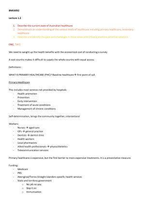 Comprehensive 371 page document listing ALL information provided by the lecturer and lecture slides with lecture references for all information and lecture objectives clearly laid out. These notes enabled me to achieve an HD score as they missed no information we were being examined on (i.e. lecturer and lecture slide content).