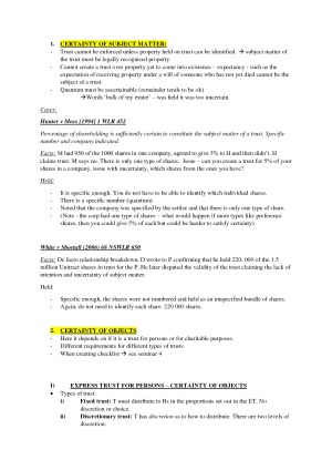 These are my longer exam notes for trusts which are great for understanding the subject and getting all the important details from all the cases. Had these with me in the exam and very helpful both for essay topics and hypos. Got a good H1 with these.