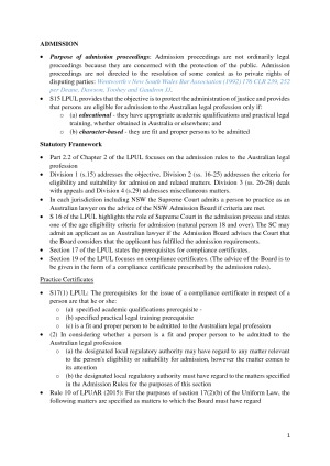 Detailed and comprehensive notes for the Legal Profession - Provide summaries and descriptions of all cases and relevant statutes. - Provides a structure for answering the take home exam. - Received High Distinction in final exam. - Extremely detailed and provide all relevant statutory material throughout the course including Solicitor / Barrister Rules etc. - Sample illustrates the structure of the notes, including all cases and statute.