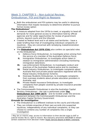 -Administrative Law -How to Approach Administrative Law -THE CONSTITUTIONAL AND LEGAL FRAMEWORK -Where to begin? Non-judicial review of administrative action -Non-Judicial Review: Ombudsman, FOI and Right to Reasons -Delegated legislation and statutory interpretation -Introduction to Judicial Review: Jurisdiction, Justiciability & Standing. -Ultra vires – Simple, Procedural and Extended -‘EXTENDED’ ULTRA VIRES -Extended ultra vires: Refusal to exercise a discretion -Procedural Fairness (1) -Hearing Rule (2) -Bias Rule, Reasons & Probative Evidence (3) - Ouster clauses and Jurisdictional Errors -Judicial Remedies