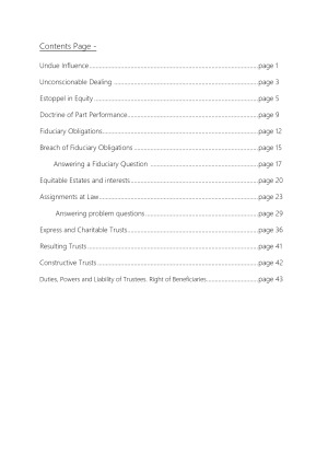 These were the notes I used in Equity and Trusts. They are a summary of class notes, textbook readings, tutorial quiz answers and practice exams. They include summaries, step guides for answering questions, case references and a contents page. They are delivered under topic based sections, and are displayed through dot points. Some of the italicised font is that taken from practice exam answers and tutorial quiz answers. They are included to provide templates for answering questions in the exam and for putting difficult concepts into context.