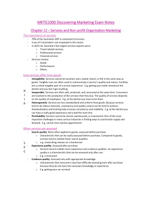 These notes are the lecture notes for chapter 12, 15, 16 and 18, which are covered in the final examination. Key definitions are bolded and acronyms/letters are used help remember key blocks of information. Chapters covered: Chapter 12: Services and Non-profit Organization Marketing Chapter 15: Marketing Communications Chapter 16: Advertising, Public Relations and Sales Promotion Chapter 18: Social Media and Marketing I received an overall mark of 91% for this unit.
