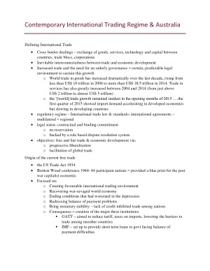 Full Course Notes for LAWS510 Topics included: - Contemporary international trading regime and Australia - GATT and WTO trading regime and principles - International financial system: IMF and World Bank - Regional and bilateral free trading arrangements - Non-tariff barriers to trade: SPS and TBT - Trade in goods: agriculture and its protectionism - Dumping and anti-dumping, subsidies and countervailing, and escape clauses - Trade in services and its pressing matters - TRIPS Agreement, TRIPS-Plus and transfer of technology - Dispute settlement of the WTO - Non-trade issues at the WTO: environment and human rights - Transactional aspects: sale and carriage of goods and payment - Developing countries in the multilateral trading system