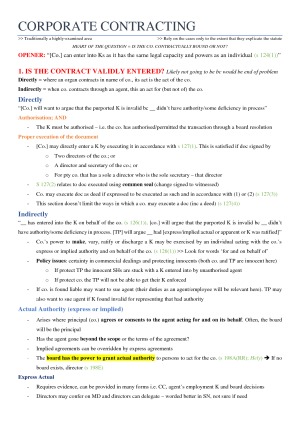 These are the notes I used for corps law. They are designed to be a step-by-step guide through the problem based questions that the exam covers. However, they cover ALL the course content and relevant policy issues. They are colour coded and include handy tips from lecturers and tutors. The preview I've uploaded is of how to do a corporate contracting problem.
