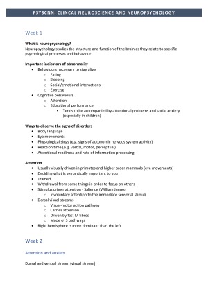 These notes contain a full summary of the material covered in lectures, tutorials, and key readings from PSY3CNN. Notes were taken during every lecture and tutorial, and were used as my primary study tool for the exam. These notes contain the following topics: - Attention and Anxiety - Eating disorders - The Neuropsychological basis of substance abuse - Psychoneuroimmunology - The Biological and Emotional Basis of Substance Abuse - Neuroscience of neurodevelopmental disorders - Neurobiology and Pathogenesis of Neurodegenerative Disorders - Neuropsychology of Healthy Aging and Alzheimer’s Disease - Consciousness and sleep - Neuropharmacology Epilepsy and traumatic brain injury Hope they help you as much as they helped me!
