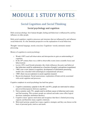 Modules 1-6 readings and lecture notes. Condenses over 600 pages from the text to 200 with dot-points of main topics and definitions of key terms Topics: Module 1: - Social Cognition & Social Thinking - Self & Identity - Attitudes Module 2: - Persuasion & Attitude Change - People in Groups - Inter-group Behavior Module 3 - Aggression - Attraction & Close Relationships - Culture Module 4 - Personality Theory in Context - The Basis of the Psychoanalytic Approach to Personality Module 5 - Learning Theory Perspectives on Personality - Cognitive Personality Theories - Humanistic Personality Theories Module 6 - The Trait Approach to Personality - Biological Basis of Personality - Further Ideas & Debates in Personality