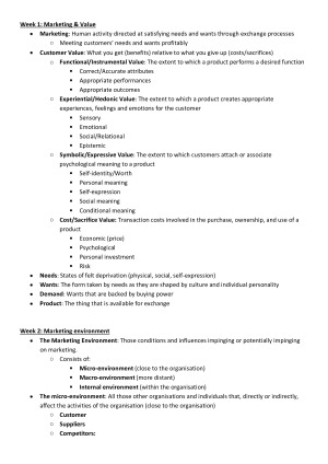 Concise and organised revision notes I used for MKF1120 exam that covered every topic that was examined in detail. Includes coloured diagrams. Topics covered in notes: - Value - Marketing environment - Buyer behaviour - STP - Marketing mix - Current issues - Strategy and planning