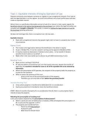 Comprehensive exam notes covering each topic with answer structures, key principles and crucial facts from each case for comparison/analysis. Topics: - Equitable Interests Arising by Operation of Law - Mortgages - Enforcement of Proprietary Interests and the Torrens System - The Principle of Indefeasibility of Title - Exceptions to Indefeasibility of Title - Unregistered Interests Under the Torrens System - Co-ownership - Relevant information fro Property A
