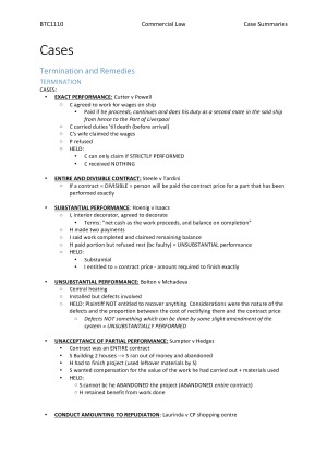 Short and concise summaries of the cases covered throughout the unit. The cases are put into dot point form that addresses the main points and arguments making it easier to find the suitable cases when revising and writing up answers to questions. The cases are sectioned by the topics: - Termination and Remedies - Australian Consumer Law - Unfair Contract Terms, Specific False Representations, Unfair Practices, Consumer Guarantees - Law of Torts - Negligent Acts Causing Damages - Law of Torts - Negligent Misstatements - The Law of Partnerships - Corporations Law I have also included sample responses of four cases that were provided in the textbook. These sample responses, from the textbook, have been transformed into a table format for easier revision and practice.