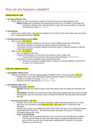 Exam scaffolds for the subject 'Migration, Refugees & Forced Migration' at Sydney University. I was the official notetaker for this subject and the notes are up to date and most useful for an open-book, problem question style exam. They are laid out in a "if X, then Y" style format to allow for quick determination of the applicable law. The first half of the scaffolds cover the criteria for key visa categories. The latter half of the notes cover the ways in which an immigrant can become unlawful, and the means by which they may regularise their status, and the remedies available to them if unsuccessful. The key topics covered are: 1. Common Entry Criteria 2. Protection (subclass 866) visa 3. Skilled migration visas 4. Employment Nomination Scheme (subclass 186) visa 5. Distinguished Talent (subclass 124) visa 6. Business Skills Migration visas 7. Partner visas 8. Child & Orphan visas 9. Parent visas 10. Carer visas 11. How do you become unlawful? 12. If unlawful, how can you regularise your status? 13. Merits review 14. Judicial review 15. Other remedies