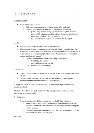 Structured Evidence Exam notes for all topics covered in Evidence except for the Introduction. Very easy to understand. Includes; Relevance, competence and compellability, privilege, Examination of witnesses, Character and credibility, Accused's right of silence, Tendency/Coincidence, Hearsay, Admissions, Illegally obtained evidence, Opinion evidence